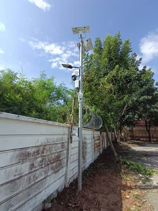 As part of setting a “virtual wall” at parts of the border where barbed wire cannot be rolled out, the first electronic surveillance pole has been put up at Aranyaprathet.