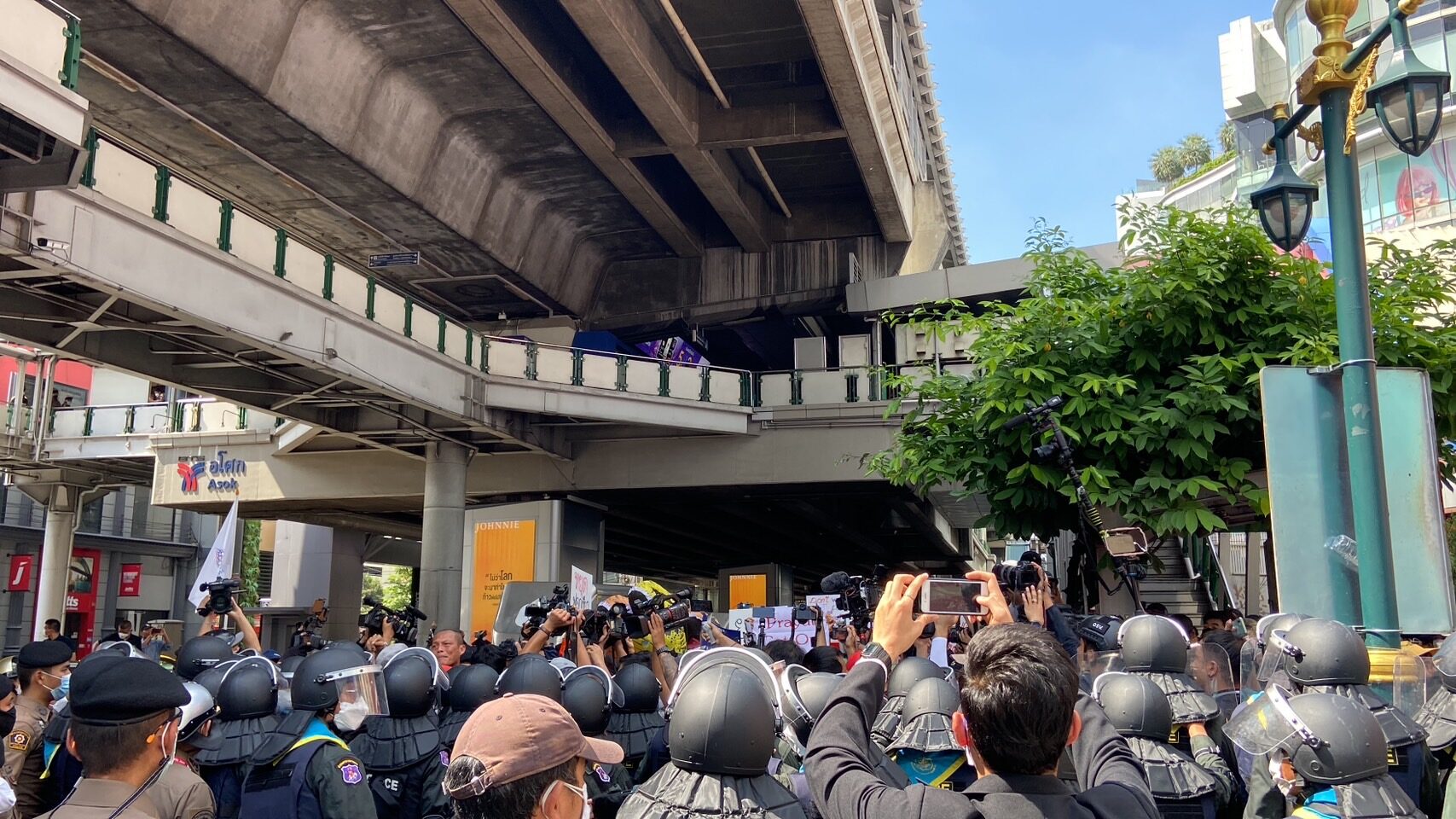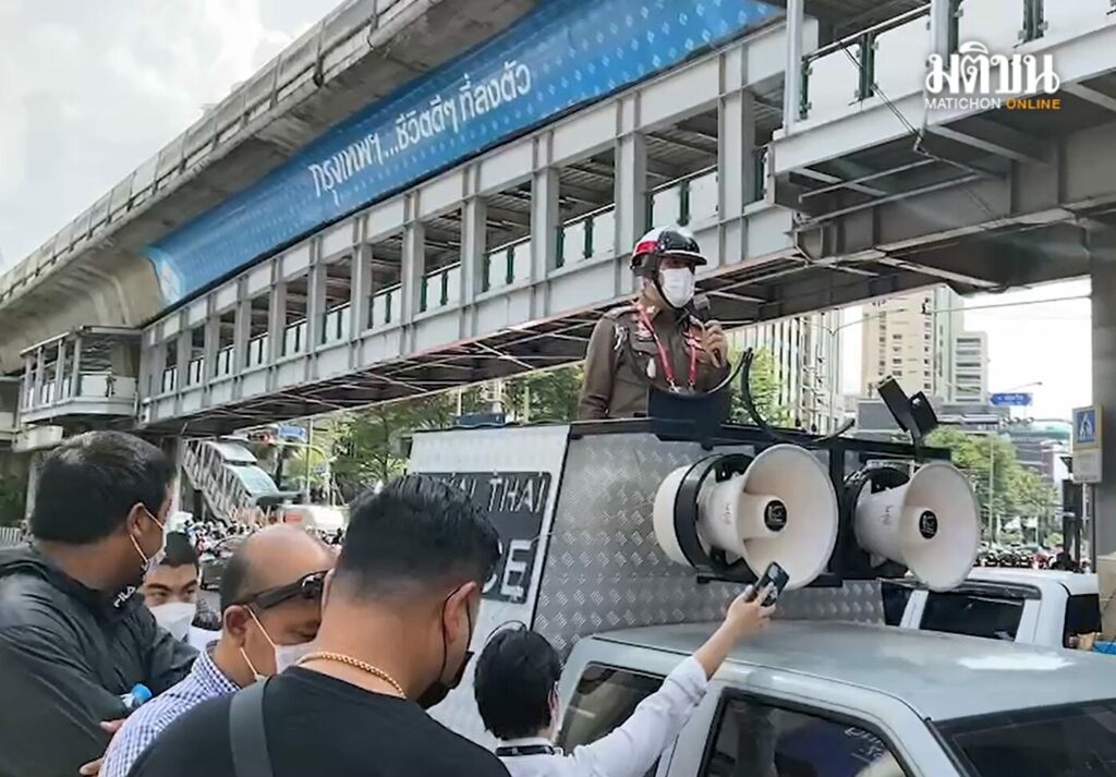 Protesters face off with police at Asoke Montri intersection this afternoon. Photos: Matichon
